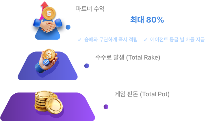 유저가 돈을 따도 파트너 수익은 줄지 않습니다. 오직 수수료를 쉐어하며, 게임이 돌아가는 만큼 귀사의 수익은 계속 누적됩니다.